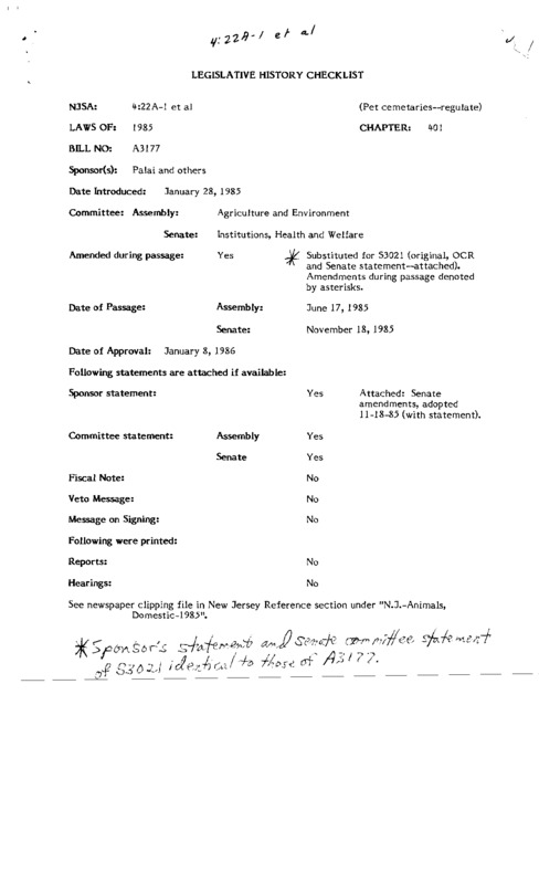NEW JERSEY LEGISLATIVE HISTORIES