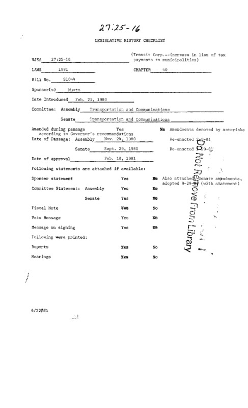 NEW JERSEY LEGISLATIVE HISTORIES